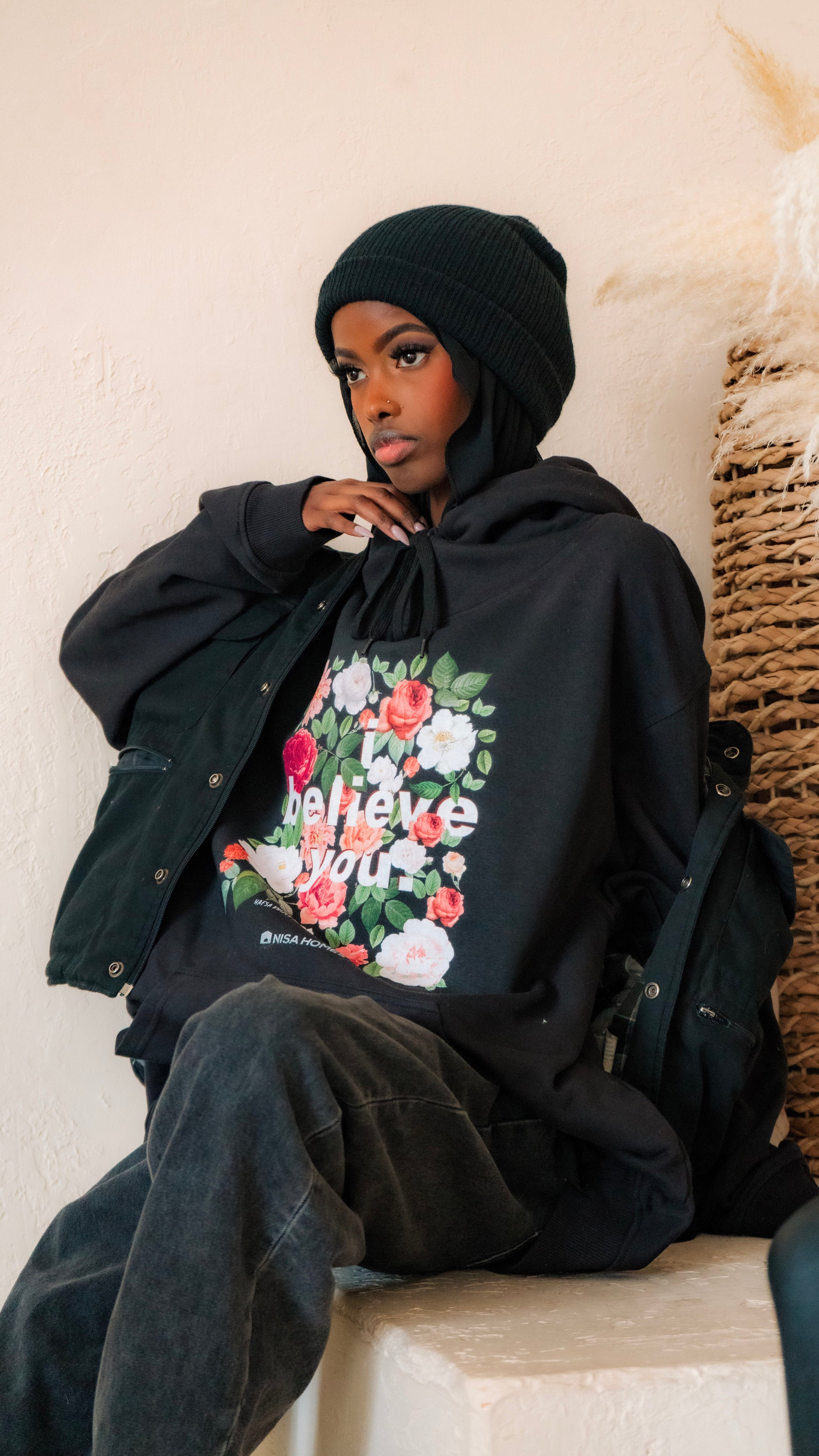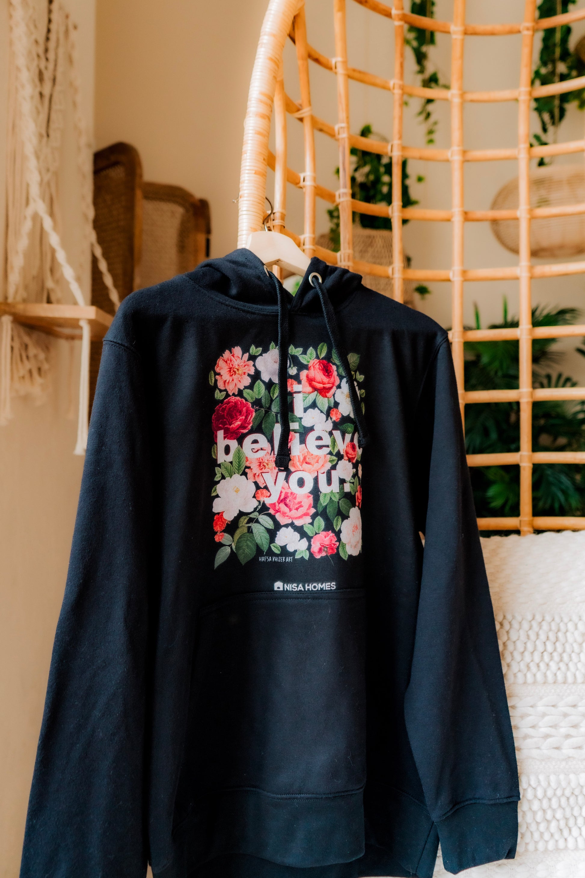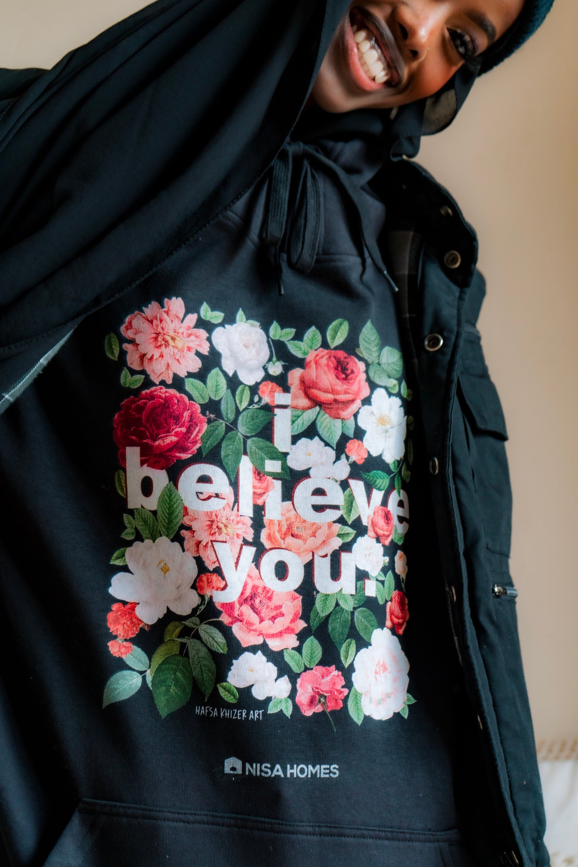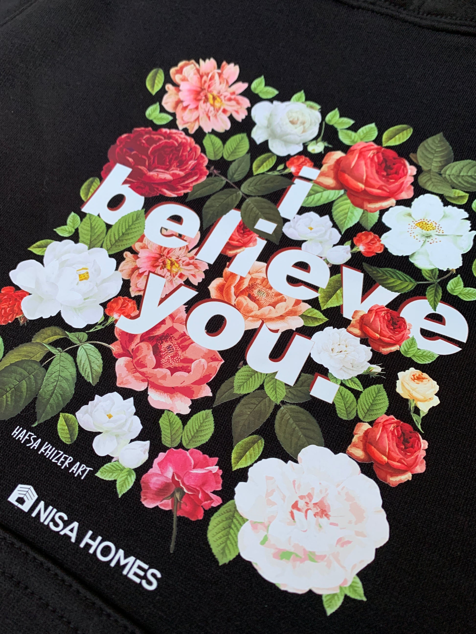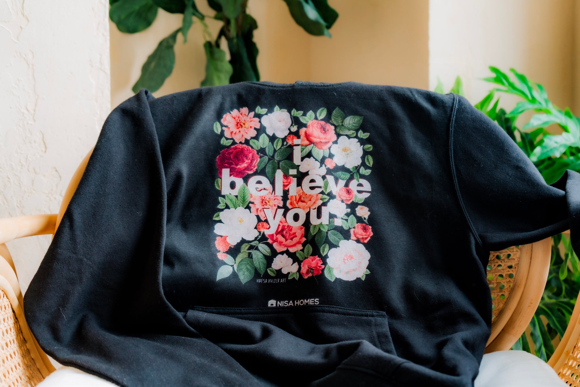 About the "I Believe You" Merch Campaign: It is a series of shirts with supportive phrases that should be the first response to women coming out about abuse, seeking help, or telling their story. The main goal of the campaign is to create a safe space and togetherness that embodies the best way we can support women: just begin by listening and validating. The phrases encourage a culture of empathy and believing survivors of abuse and sexual assault.